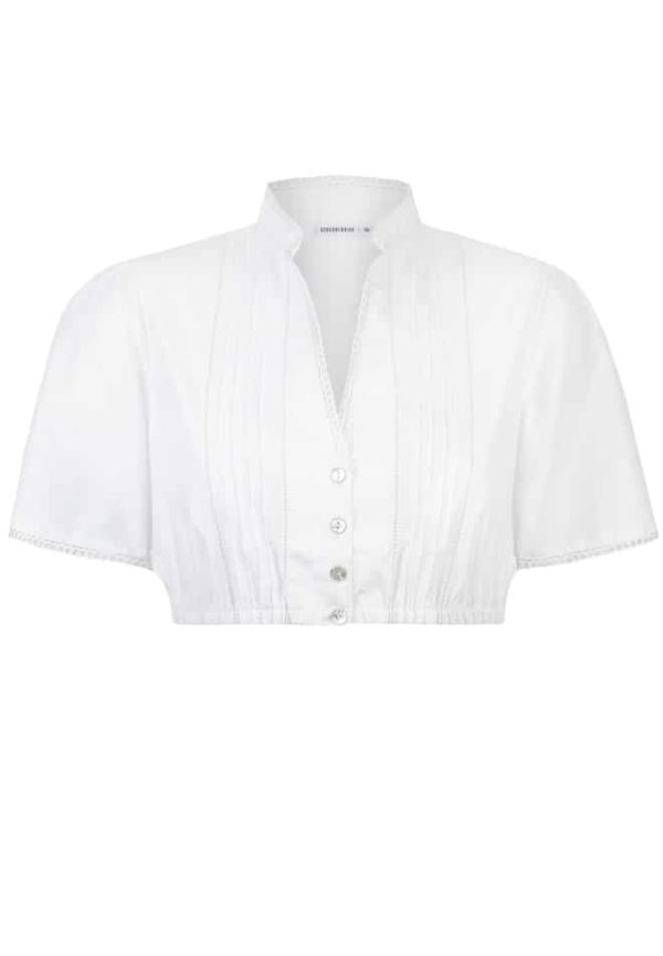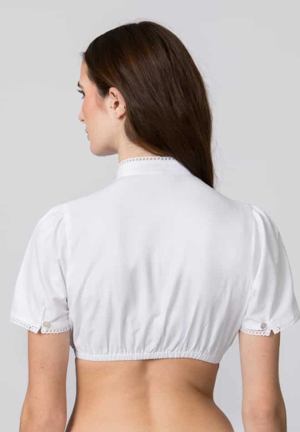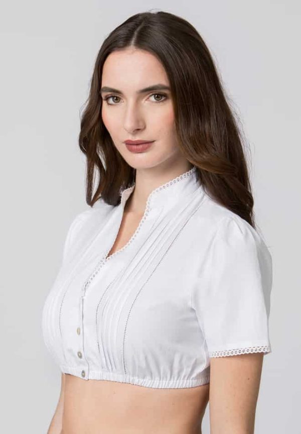 Die Dirndlbluse Ariana von Stockerpoint in weiß besticht durch ihr hochgeschlossenes Design und liebevolle Details. Diese Damenbluse ist mit feiner Spitze am V-Ausschnitt und an den Ärmeln veredelt. Der kleine Stehkragen setzt edle Akzente und prägt das elegante Erscheinungsbild. Geschlossen wird die Bluse mit traditionellen Trachtenknöpfen. Der hochwertige weiße Baumwollstoff macht die Bluse vielseitig einsetzbar. Sie lässt sich perfekt zu vielen Dirndln kombinieren und ist ein hochwertiges Must-Have für jede Trachtenliebhaberin.|