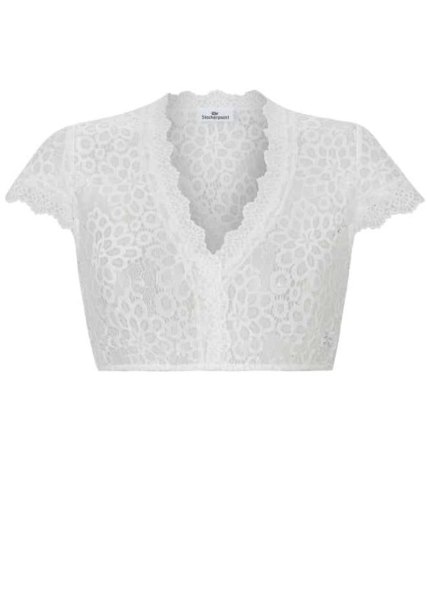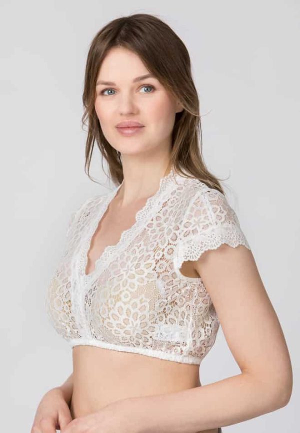 Dirndlbluse Kensy von Stockerpoint in creme. Diese hochwertige Damenbluse verzaubert mit zahlreichen liebevollen Details und gehört zu unseren absoluten Lieblingsstücken. Der hochwertige Spitzenstoff prägt dieses wunderschöne Modell. Der V-Ausschnitt ist mit einer Bogenkante veredelt und umschmeichelt gekonnt das Dekolleté. Die kurzen Ärmel sorgen für einen zusätzlichen Akzent und runden das Design perfekt ab.