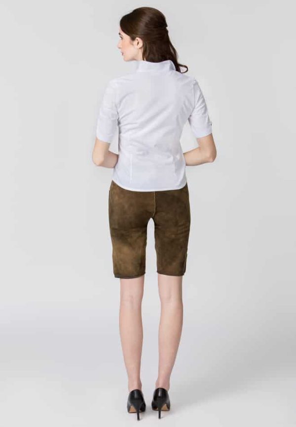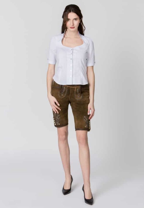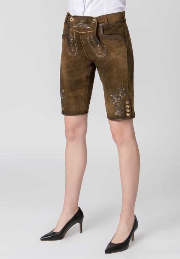 Lederhose Piper von Stockerpoint in stein geäscht. Die Trachten Bermuda aus hochwertig gegerbtem, weichem Wildbock Leder in Hirschoptik zeichnet sich durch den ausgefallenen Antik-Look aus. Die Hose ist mit einer traditionellen Stickerei aufwendig bestickt und liebevoll von Hand gespeckt. Hochwertige Hornknöpfe runden das gesamte Erscheinungsbild gekonnt ab und prägen den typischen Trachtenstil. Die Hose ist vielseitig kombinierbar und zieht alle Blicke auf sich.