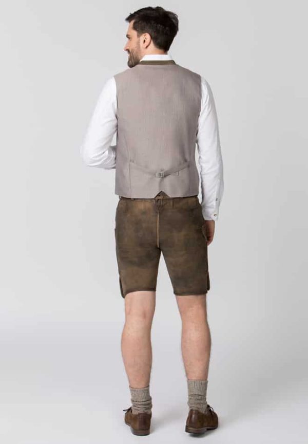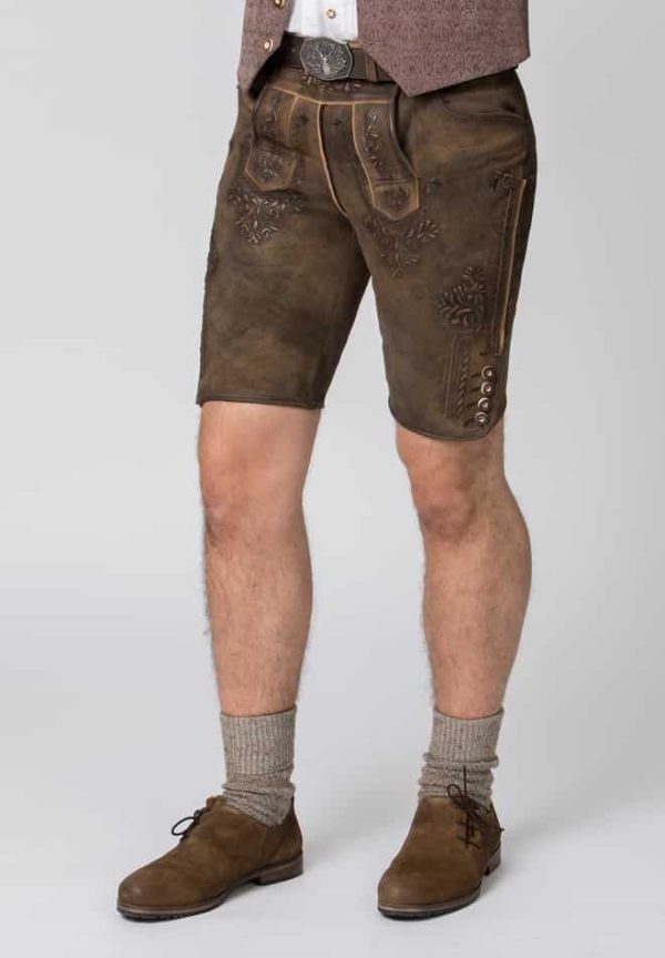 Trachtenlederhose Artur von Stockerpoint Classics. Die kurze Lederhose aus hochwertig gegerbtem Wildbock Leder in Hirschoptik zeichnet sich durch die außergewöhnliche Strukturierung aus und harmoniert perfekt mit den typischen Hornknöpfen. Die traditionelle Stickerei steht dezent im Vordergrund und verleiht dem Modell ihren typischen Charakter. Die Hose wird mit einem passenden Gürtel geliefert. Sie ist ein Allrounder und lässt sich zu vielen Trachtenoutfits perfekt kombinieren.|
