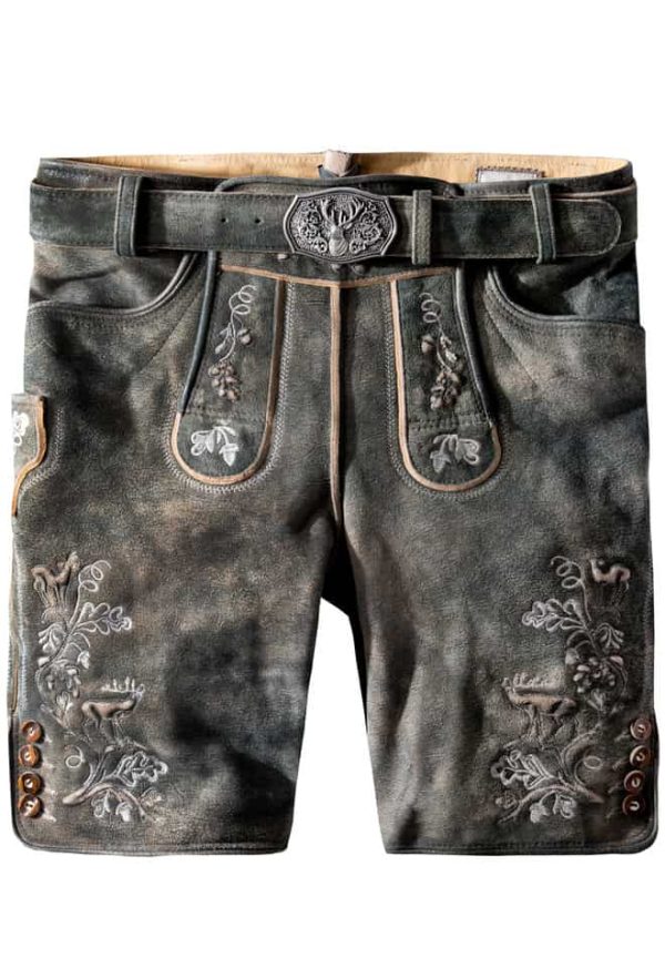 Trachtenlederhose Bastian von Stockerpoint Classics. Die kurze Lederhose aus hochwertig gegerbten Wildbock Leder in Hirschoptik ist in Design und Qualität auf Zeitlosigkeit und Langlebigkeit ausgelegt. Das Modell wird mit traditionellen Eichenlaub- und Hirschmotiven Motiven liebevoll bestickt. Die Trachtenhose wird nach alten Vorbildern gefertigt und mit viel Herzblut von Hand gespeckt. Dadurch entsteht der typische, trendige Vintage Look. Die Lederhose wird mit einem Gürtel mit Hirschmotiv in altsilber geliefert. Sie lässt sich wunderbar zu deinem Lieblingsoutfit kombinieren.