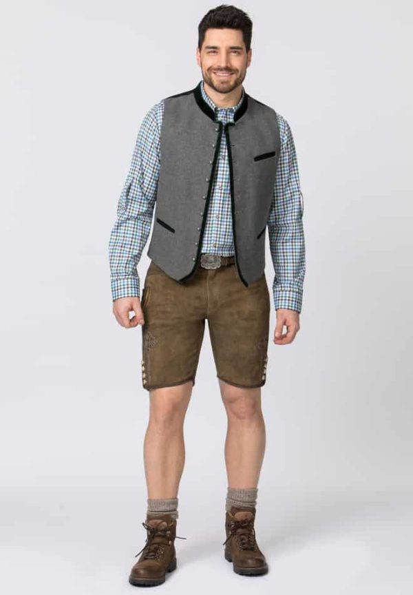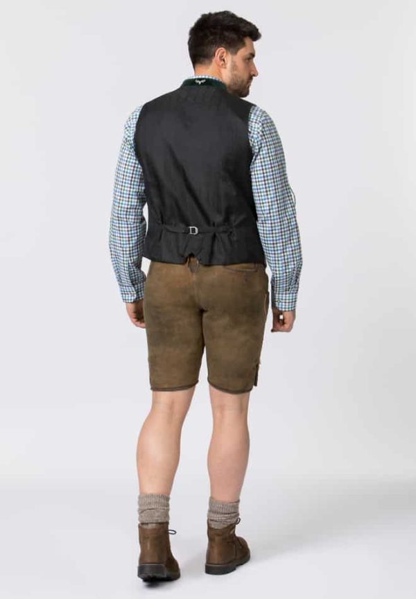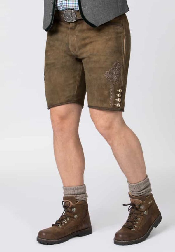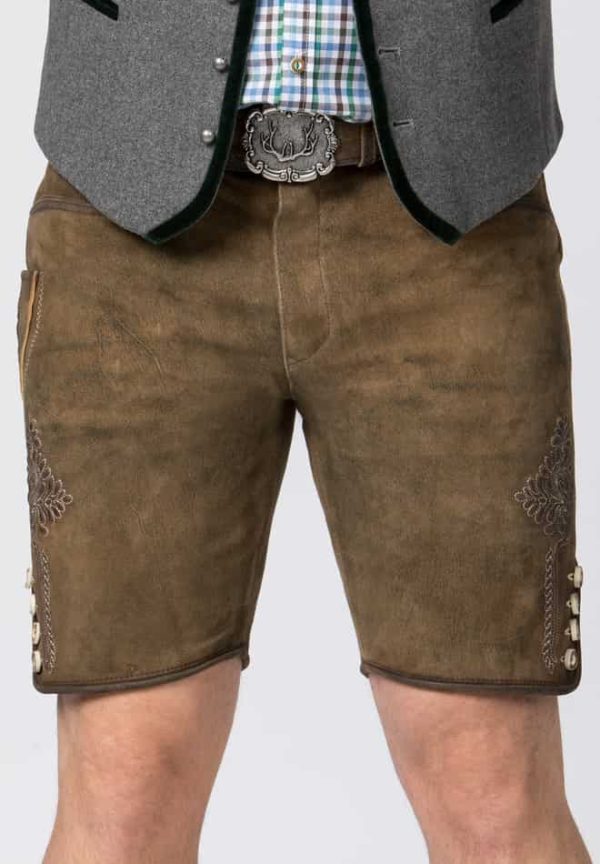 Trachtenlederhose Corbi von Stockerpoint Classics. Die kurze Lederhose aus hochwertig gegerbtem Wildbock Leder in Hirschoptik zeichnet sich durch die außergewöhnliche Strukturierung aus und harmoniert perfekt mit den klassischen Hornknöpfen. Statt mit einem Latz wird diese Hose mit Reißverschluss gefertigt. Die traditionelle Stickerei steht dezent im Vordergrund und verleiht dem Modell ihren typischen Charakter. Die Hose wird mit einem Gürtel und einer Schließe mit Hirschmotiv in altsilber geliefert. Sie ist ein Allrounder und lässt sich zu vielen Trachtenoutfits perfekt kombinieren.