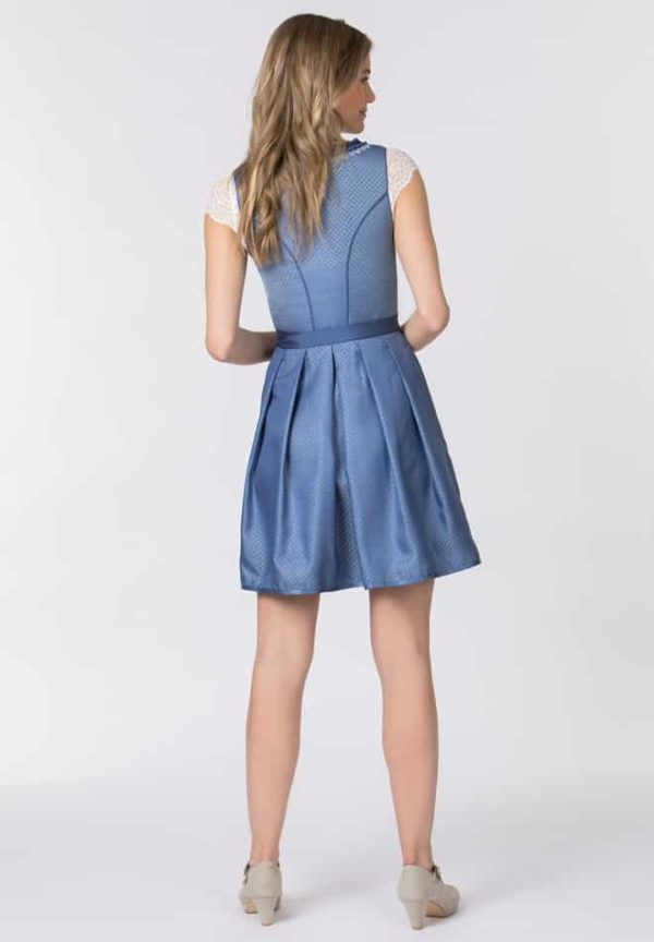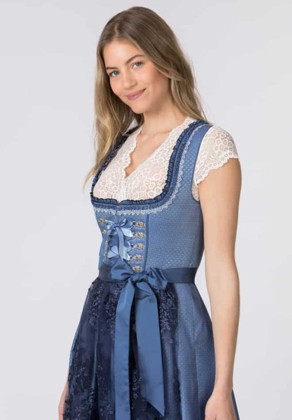 Dirndl Beliva mit Spitzenschürze für Damen von Wiesnwuid in blau. Das geschmackvolle Dirndl begeistert durch das ansprechende Jacquard Muster und ist mit bezaubernden Details versehen. Für die feminine Note sorgen die eingearbeiteten Rüschen am Dekolleté, die aufgenähten Zierborten sowie die verzierten Miederhaken. Die Schnürung mit den zwei verschieden farbigen Satinbändern unterstreicht den femininen Look. Durch die romantische, farblich abgestimmte Spitzenschürze wird das Gesamtbild gekonnt abgerundet. Kombipartner: Dirndlbluse Jasmin in weiß.