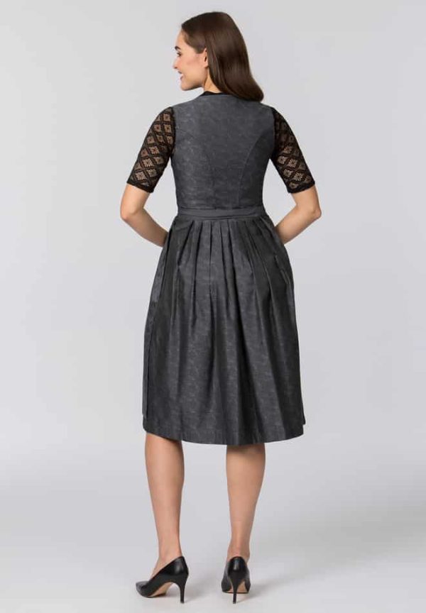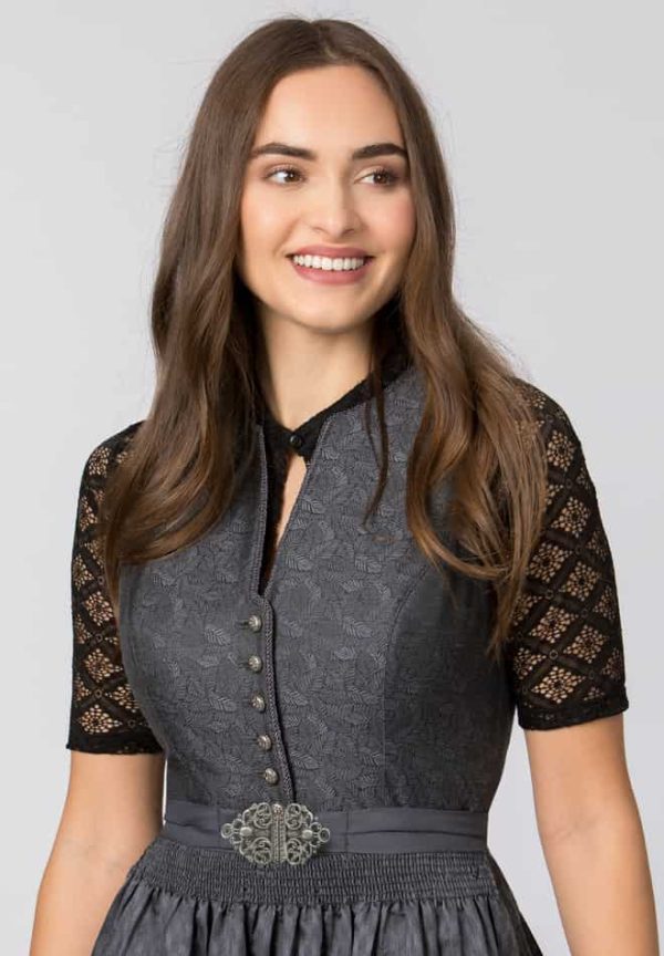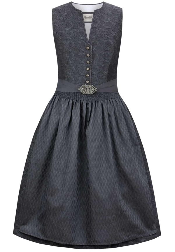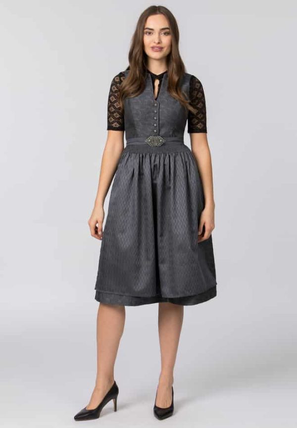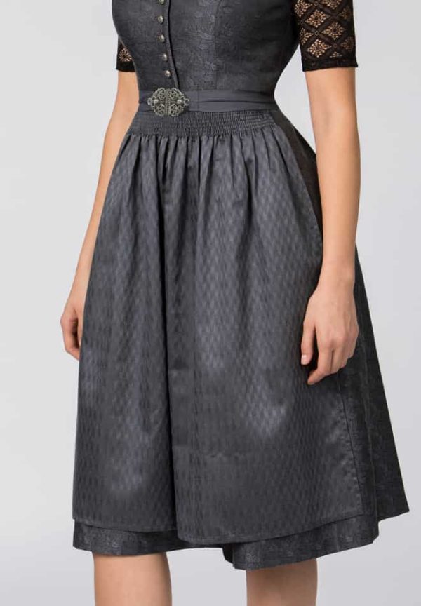 Das Dirndl Enna von Heimatgwand verkörpert zeitlose Eleganz und verbindet gekonnt Tradition mit ästhetischem Design. In tonigem Grau gehalten, strahlt es den perfekten Mix aus klassischem Charme und anspruchsvoller Stilistik aus – ideal für Frauen, die sowohl Stil als auch höchste Qualität schätzen. Besonderes Augenmerk liegt auf dem V-Ausschnitt der das Dekolleté auf anmutige Weise zur Geltung bringt und durch eine kunstvoll geflochtene Borte zusätzlich verziert wird. Gefertigt aus edlem Jacquardstoff, verleiht das Dirndl Enna der Trägerin einen besonderen Glanz und hebt die hochwertige Verarbeitung hervor. Der in Falten gelegte Rock mit einer praktischen Innentasche bietet nicht nur Komfort, sondern auch eine dezente Raffinesse. Abgerundet wird das Design durch eine edle Schürze, die dem Dirndl seinen luxuriösen Charakter verleiht. Silberfarbige, geprägte Knöpfe und eine hochwertige Schließe in Altsilber setzen edle Akzente, während Formstäbchen im Mieder eine perfekte Silhouette zaubern. Das Heimatgwand Dirndl Enna in hellem Grau ist ein Must-have für stilbewusste Frauen, die auf der Suche nach einem einzigartigen Kleidungsstück sind, das sowohl Tradition als auch modernen Chic verkörpert.