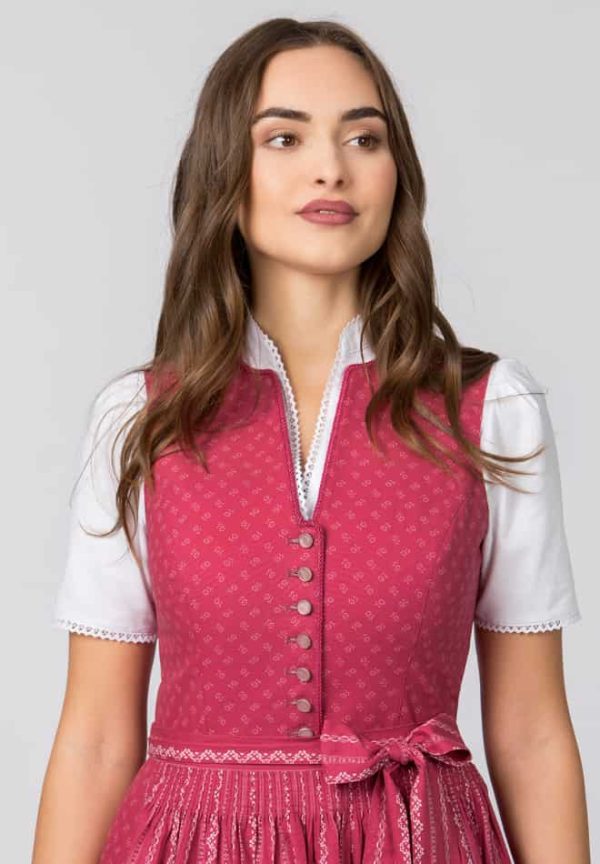 Dirndl Fina von Heimatgwand – Ein Klassiker der traditionellen Tracht Das Dirndl Fina aus der Heimatgwand Kollektion verkörpert zeitlose Eleganz und verbindet gekonnt Tradition mit ästhetischem Design. In kräftigen Farben gehalten, strahlt es den perfekten Mix aus klassischem Charme und anspruchsvoller Stilistik aus – ideal für Frauen, die sowohl Stil als auch höchste Qualität schätzen. Der besondere Charme dieses Dirndls liegt im hochgeschlossenen V-Ausschnitt, der mit einer feinen Borte kunstvoll veredelt wurde. Dieser Kragen verleiht dem Dirndl eine edle Ausstrahlung und setzt einen eleganten Akzent, der sofort ins Auge fällt. Der edle Stoff aus pflegeleichter Baumwolle, verziert mit einem traditionellen Druckmotiv, unterstreicht nicht nur die hohe Qualität, sondern auch den einzigartigen Charakter des Dirndls. Der in Falten gelegte Rock, ausgestattet mit einer praktischen Innentasche, vereint hohen Tragekomfort mit luftiger Eleganz. Die bedruckte Schürze betont die klassische Silhouette und rundet das Dirndl auf elegante Weise ab. Die edlen Perlmuttknöpfe unterstreichen die traditionelle Raffinesse des Designs, während Formstäbchen im Mieder die feminine Silhouette betonen und das Dirndl perfekt in Szene setzen. Das Dirndl Fina ist mehr als nur ein Kleid – es ist ein Statement für traditionsbewusste Frauen, die ein klassisches Dirndl suchen, das sowohl die Werte der Tradition wahrt als auch durch hochwertige Verarbeitung und stilvolles Design überzeugt.