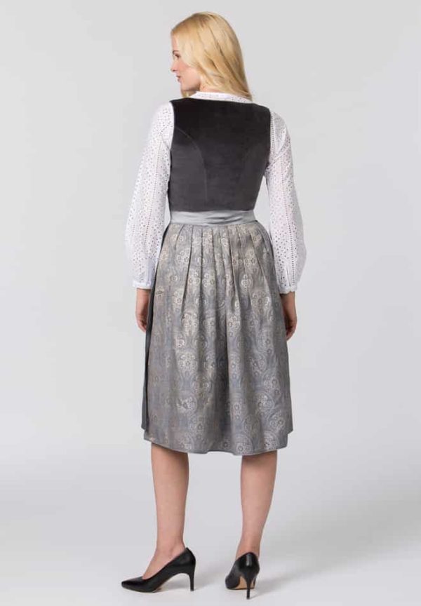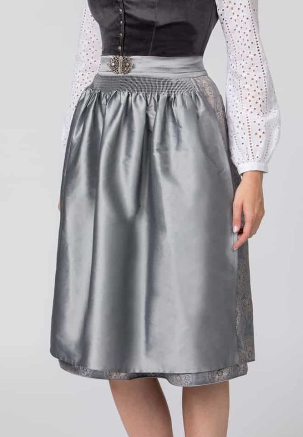 Das Dirndl Indira von Heimatgwand ist ein wahres Meisterwerk für Liebhaberinnen traditioneller Trachtenmode. Das Modell verbindet gekonnt klassische Tradition mit luxuriösem Design und setzt ein stilvolles Statement für anspruchsvolle Frauen. Der elegante Herz-Ausschnitt betont das Dekolleté auf raffinierte Weise und wird durch einen schlichten Paspol zusätzlich veredelt. Exklusive, silberfarbene Knöpfe, verziert mit funkelnden Kristallen, setzen geschmackvolle Akzente. Formstäbchen im Mieder sorgen für eine schmeichelhafte Silhouette und betonen die feminine Figur. Das Mieder aus hochwertigem Samtstoff verleiht dem Dirndl Indira eine besondere Anmut und unterstreicht die exzellente Verarbeitung. Der in Falben gelegte Rock, versehen mit einem exklusiven Motiv, bietet nicht nur Komfort, sondern auch dezente Raffinesse. Eine praktische Innentasche rundet das Design funktional ab. Die edle, zweifarbige Polyester-Schürze, perfekt auf das Dirndl abgestimmt, wird mit einer silberfarbenen Schließe stilvoll akzentuiert und verleiht dem Outfit einen luxuriösen Touch. Diese harmonische Verbindung rundet das Design stilvoll ab. Das Dirndl Indira ist die perfekte Wahl für stilbewusste Frauen, die ein außergewöhnliches Kleidungsstück suchen, das Tradition mit modernem Chic vereint und jedem Anlass eine elegante, luxuriöse Note verleiht.
