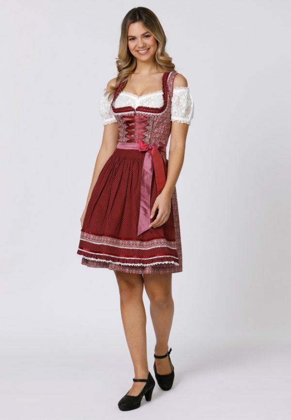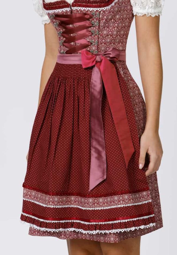 Dirndl Kim für Damen von Wiesnwuid. Das edle Dirndl aus pflegeleichter Baumwolle verzaubert durch das florale gedruckte Allover Muster und ist mit liebevollen Details versehen. Für den trendigen Trachten Look sorgen die eingearbeiteten Rüschen am Dekolleté, die aufgenähten Zierborten sowie die verzierten Miederhaken. Die Schnürung mit farbigem Satinband unterstreicht dieses stilvolle Design. Durch die hochwertige, farblich abgestimmte Schürze mit Zierborten wird das Gesamtbild gekonnt abgerundet. Ein Lieblingsstück für viele Gelegenheiten.
