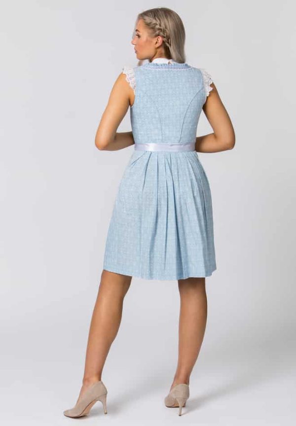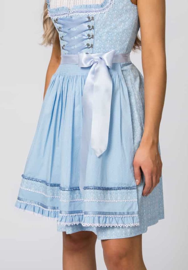 Dirndl Kim für Damen von Wiesnwuid. Das edle Dirndl aus pflegeleichter Baumwolle verzaubert durch das florale gedruckte Allover Muster und ist mit liebevollen Details versehen. Für den trendigen Trachten Look sorgen die eingearbeiteten Rüschen am Dekolleté, die aufgenähten Zierborten sowie die verzierten Miederhaken. Die Schnürung mit farbigem Satinband unterstreicht dieses stilvolle Design. Durch die hochwertige, farblich abgestimmte Schürze mit Zierborten wird das Gesamtbild gekonnt abgerundet. Ein Lieblingsstück für viele Gelegenheiten.