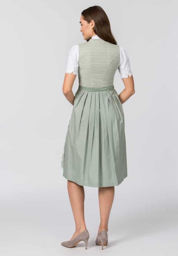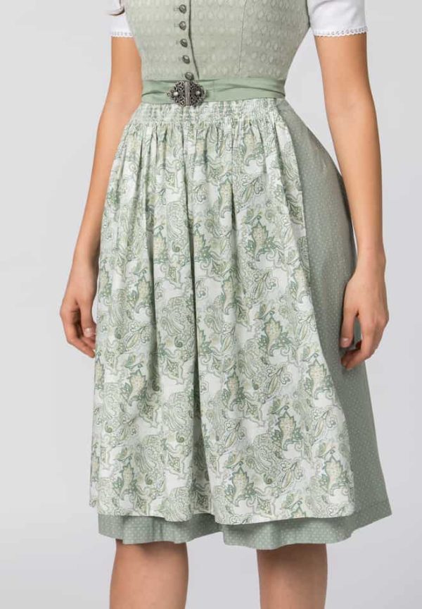 Das Dirndl Leandra aus der Heimatgwand Kollektion verkörpert zeitlose Eleganz und kombiniert traditionelles Handwerk mit modernem Design. In einem hellen Salbei gehalten, strahlt es den perfekten Mix aus klassischem Charme und anspruchsvoller Stilistik aus – ideal für Frauen, die sowohl Stil als auch höchste Qualität schätzen. Der besondere Charme dieses Dirndls liegt im hochgeschlossenen V-Ausschnitt, der mit einem feinen, passenden Paspol kunstvoll veredelt wurde. Dieser Kragen verleiht dem Dirndl eine edle Ausstrahlung und setzt einen eleganten Akzent. Der edle Stoff aus pflegeleichter Baumwolle, verziert mit einem traditionellen Druckmotiv, unterstreicht nicht nur die hohe Qualität, sondern auch den einzigartigen Charakter des Dirndls. Der in Falten gelegte Rock verleiht dem Dirndl Leichtigkeit und Bewegung und betont die feminine Silhouette. Eine praktische Innentasche fügt zudem funktionale Raffinesse hinzu. Die stilvolle, bedruckte Schürze mit silberfarbiger Schließe, sorgt für einen perfekten Sitz und rundet das Dirndl harmonisch ab. Die feinen, silbernen Knöpfe mit funkelnden Kristallen unterstreichen die traditionelle Raffinesse des Dirndls, während Formstäbchen im Mieder die feminine Silhouette betonen und das Dirndl perfekt in Szene setzen. Das Dirndl Leandra ist mehr als nur ein Dirndl – es ist ein Statement für traditionsbewusste Frauen, die ein klassisches Modell suchen, das sowohl die Werte der Tradition wahrt als auch durch hochwertige Verarbeitung und stilvolles Design überzeugt.