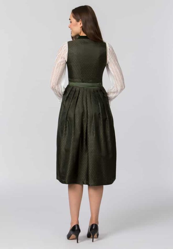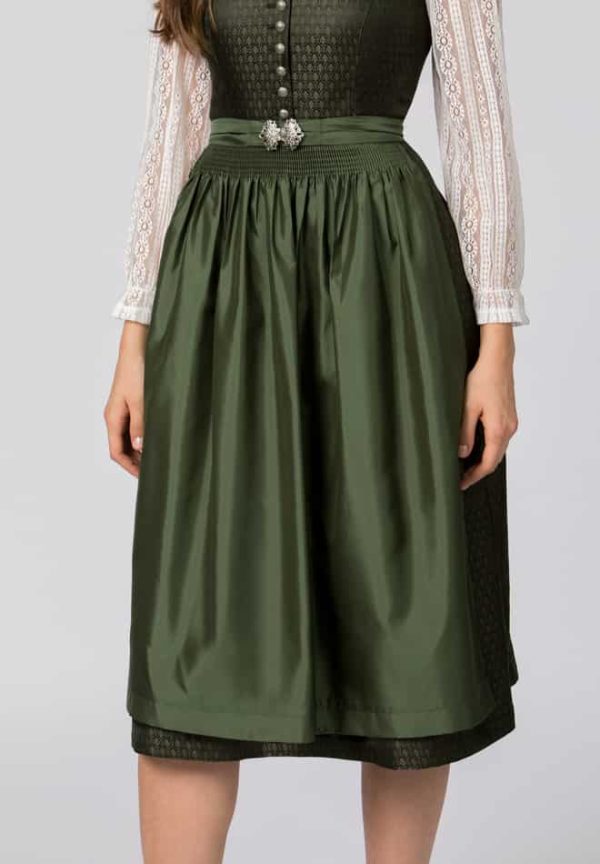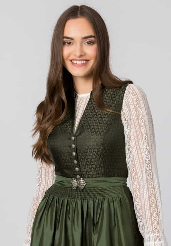 Das Dirndl Lucille von Heimatgwand ist ein wahrer Schatz für Liebhaberinnen exquisiter Trachtenmode. Das Modell vereint Tradition und luxuriöses Design zu einem stilvollen Statement für anspruchsvolle Frauen. Ein besonderer Blickfang ist der V-Ausschnitt mit Stehkragen aus hochwertigem Samt, der das Dekolleté geschmackvoll betont und durch einen harmonisch abgestimmten Paspel zusätzlich verziert wird. Hergestellt aus edlem Jacquardstoff, verleiht das Dirndl Lucille der Trägerin einen besonderen Glanz und hebt die exzellente Verarbeitung hervor. Der gereihte Rock, ausgestattet mit einer praktischen Innentasche, bietet nicht nur Komfort, sondern auch eine subtile Raffinesse. Das Design wird durch eine elegante Schürze aus Polyester abgerundet, die dem Dirndl seinen luxuriösen Charme verleiht. Silberfarbene, geprägte Knöpfe und eine edle Schließe in Altsilber setzen stilvolle Akzente, während Formstäbchen im Mieder eine perfekte Silhouette schaffen. Das Dirndl Lucille von Heimatgwand ist ein unverzichtbares Must-have für stilbewusste Frauen, die ein einzigartiges Kleidungsstück suchen, das Tradition und modernen Chic auf perfekte Weise vereint.