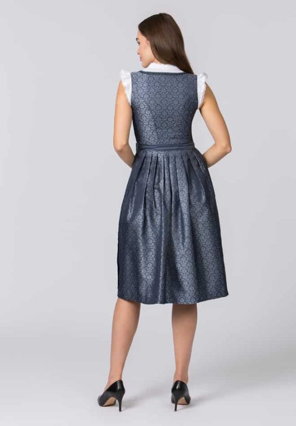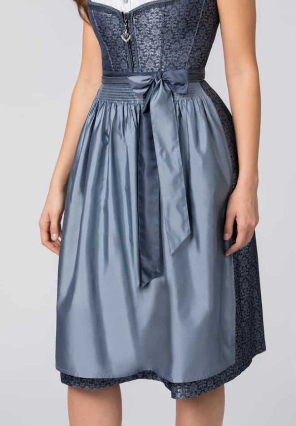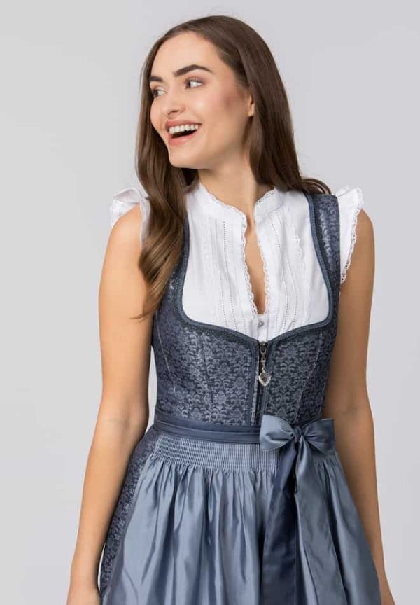 Das Dirndl Merrit von Heimatgwand ist ein wahres Meisterwerk für Liebhaberinnen exquisiter Trachtenmode. In zartem Rauchblau gehalten, vereint es Tradition und luxuriöses Design zu einem stilvollen Statement für anspruchsvolle Frauen. Der elegante Herzausschnitt setzt das Dekolleté gekonnt in Szene und wird durch eine kunstvoll gearbeitete Borte zusätzlich veredelt. Der verdeckte Reißverschluss mit einem schmuckvollen Anhänger setzt feine Akzente, während Formstäbchen im Mieder eine schmeichelhafte Silhouette zaubern. Gefertigt aus hochwertigem Jacquardstoff, verleiht das Dirndl Merrit der Trägerin einen einzigartigen Charme und unterstreicht die erstklassige Verarbeitung. Der in Falten gelegte Rock mit einer praktischen Innentasche sorgt für Komfort und dezente Raffinesse. Eine edle, farblich perfekt abgestimmte, zweifarbige Polyesterschürze rundet das Design ab und unterstreicht den luxuriösen Charakter des Dirndls. Das Heimatgwand Dirndl Merrit in Rauchblau ist die perfekte Wahl für stilbewusste Frauen, die auf der Suche nach einem außergewöhnlichen Kleidungsstück sind, das Tradition mit modernem Chic verbindet und jedem Anlass eine luxuriöse Note verleiht.
