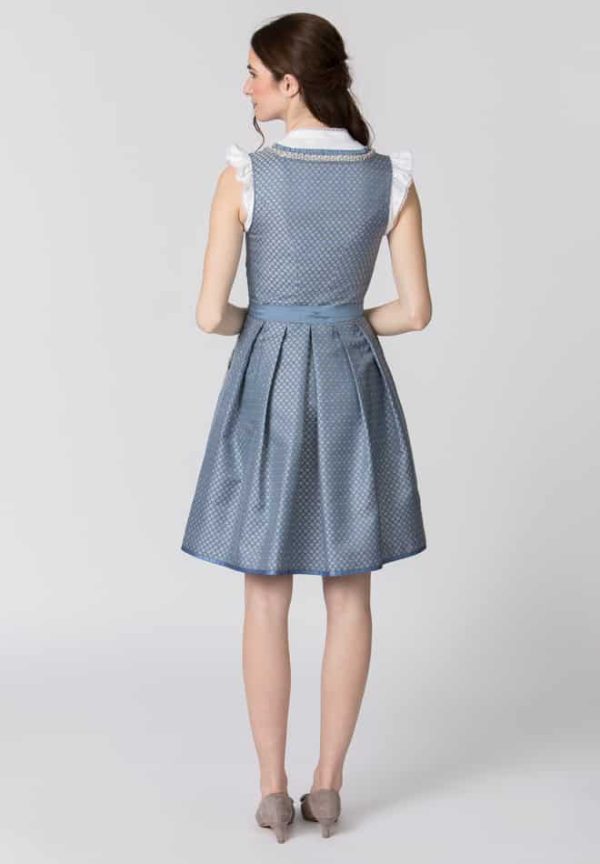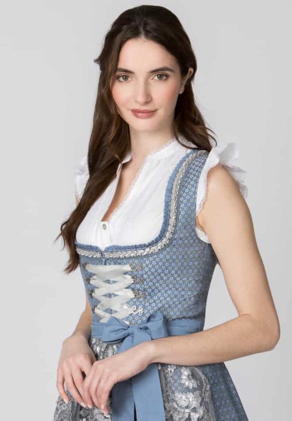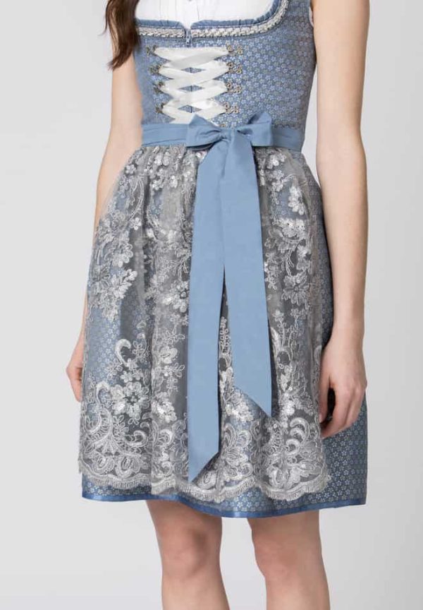 Dirndl Nivia mit Spitzenschürze für Damen von Wiesnwuid in hellblau. Das stilvolle Dirndl begeistert durch das trendige Jacquard Muster und ist mit liebevollen Details versehen. Für den gelungenen Trachten Look sorgen die eingearbeiteten Rüschen am Dekolleté, die aufgenähten Zierborten sowie die verzierten Miederhaken. Die Schnürung mit den zwei passenden Satinbändern unterstreicht den femininen Look. Durch die zauberhafte, farblich abgestimmte Spitzenschürze wird das Gesamtbild gekonnt abgerundet. Kombipartner: Dirndlbluse B-9010 in weiß.