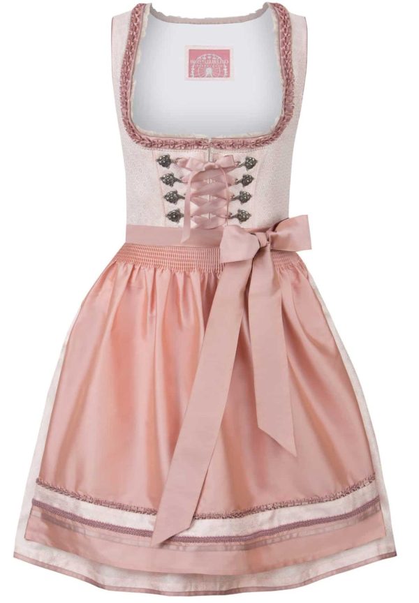 Dirndl Sally für Damen von Wiesnwuid in rose. Das zeitlose Dirndl begeistert durch den edlen Jacquardstoff und ist mit liebevollen Details versehen. Für den trendigen Trachten Look sorgen die eingearbeiteten Rüschen am Dekolleté, die aufgenähten Zierborten sowie die verzierten Miederhaken. Die Schnürung mit farbigem Satinband unterstreicht dieses edle Design. Durch die hochwertige, farblich abgestimmte Schürze mit Zierborten wird das Gesamtbild gekonnt abgerundet. Kombipartner: Dirndlbluse Cinzia in creme.