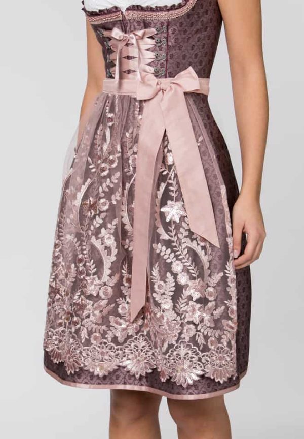 Dirndl Palina für Damen von Wiesnwuid in bordeaux. Das edle Dirndl begeistert durch das trendige Jacquard Muster und ist mit liebevollen Details versehen. Für die feminine Note sorgen die eingearbeiteten Rüschen am Rundausschnitt, die aufgenähten Zierborten sowie die verzierten Miederhaken in altsilber. Durch die filigrane, farblich abgestimmte Spitzenschürze entsteht der besondere Look. Die Schnürung aus einem farbig passenden Satinband unterstreicht das edle Design. Ein absolutes Highlight für jede Dirndlträgerin. Kombipartner: Dirndlbluse Jasmin in weiß.
