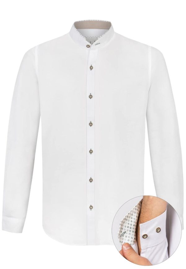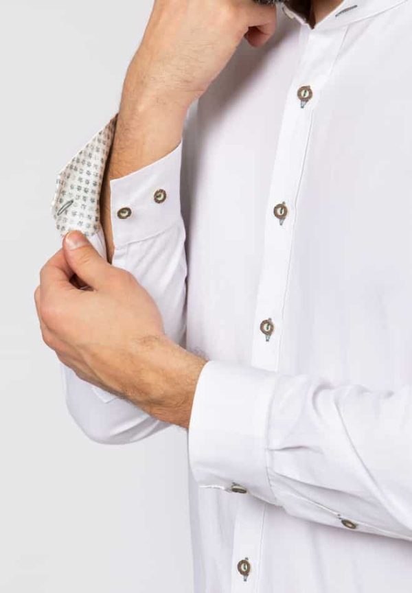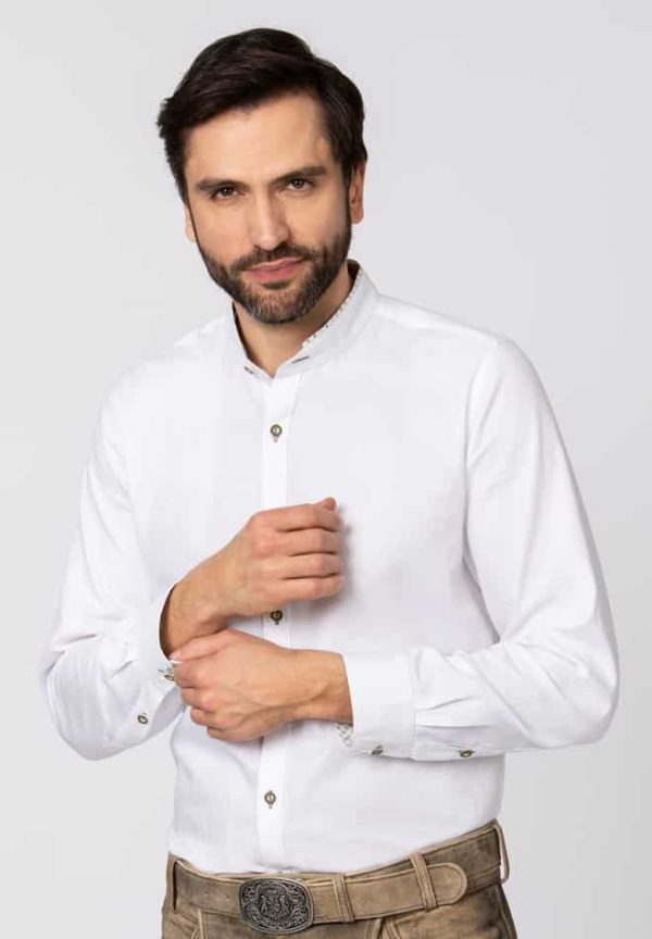 Trachtenhemd Reno von Stockerpoint Classics in weiß-grün. Das edle Stehkragen-hemd aus hochwertiger Baumwoll-Qualität ist die perfekte Ergänzung zum modernen Trachtenoutfit. Dieses Modell setzt raffinierte Akzente mit farbigem Besatz am Innenkragen, Innenmanschette und Knopfleiste sowie mit hochwertiger Verarbeitung in Lederoptik am Innenkragen. Es ist unentbehrlich als Kombipartner zu unseren Trachtenwesten und Trachtensakkos. Das Hemd ist in „Comfort Fit“ geschnitten und passt sich jeder Körperform perfekt an. Die trachtigen Hornknöpfe und die farblich abgestimmten Knopflöcher verleihen eine besondere Note und runden das Gesamtbild gekonnt ab.