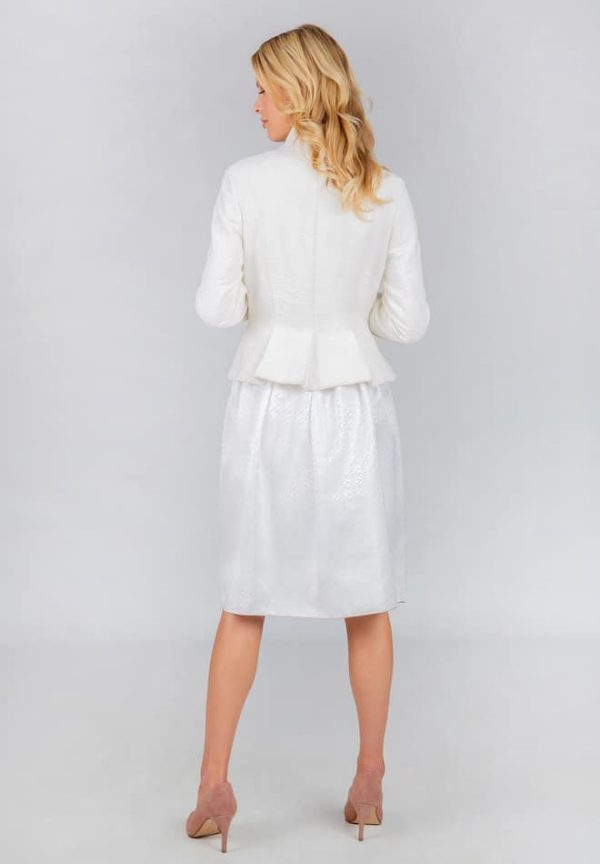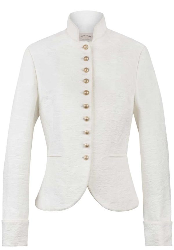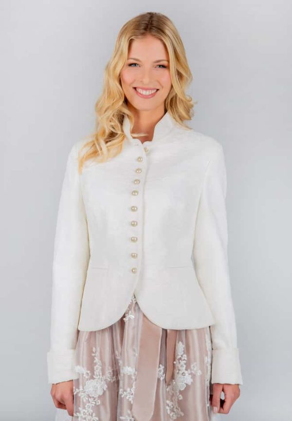 Trachtenjacke Francesca von Bergfeuer in creme. Die stilvolle Jacke begeistert durch das exklusive Jacquard Muster und ist mit liebevollen Details versehen. Das Modell überzeugt durch den figurbetonten, taillierten Schnitt und durch sein komfortables Stretch Material. Der Rücken ist mit einem Schößchen gefertigt und prägen den exklusiven Style. Ein absolutes Highlight zu Trachtenhochzeiten, Festen und Feiern.