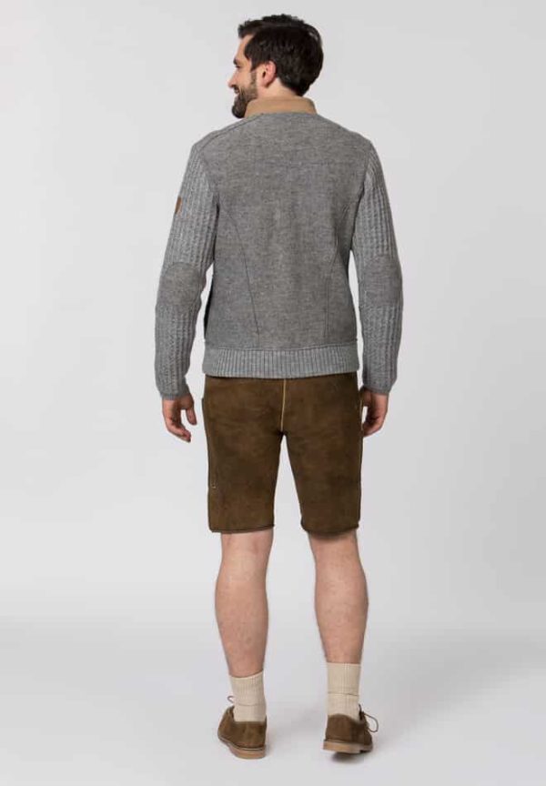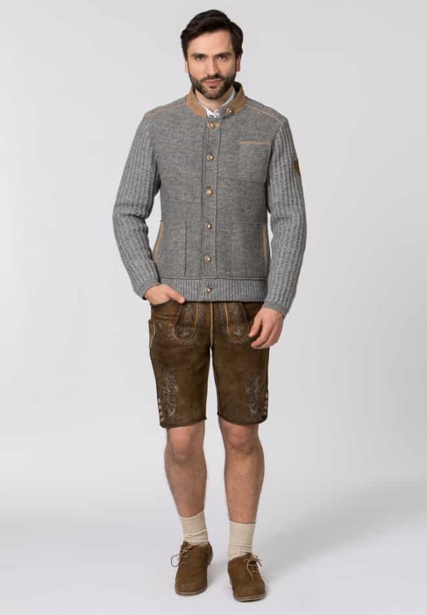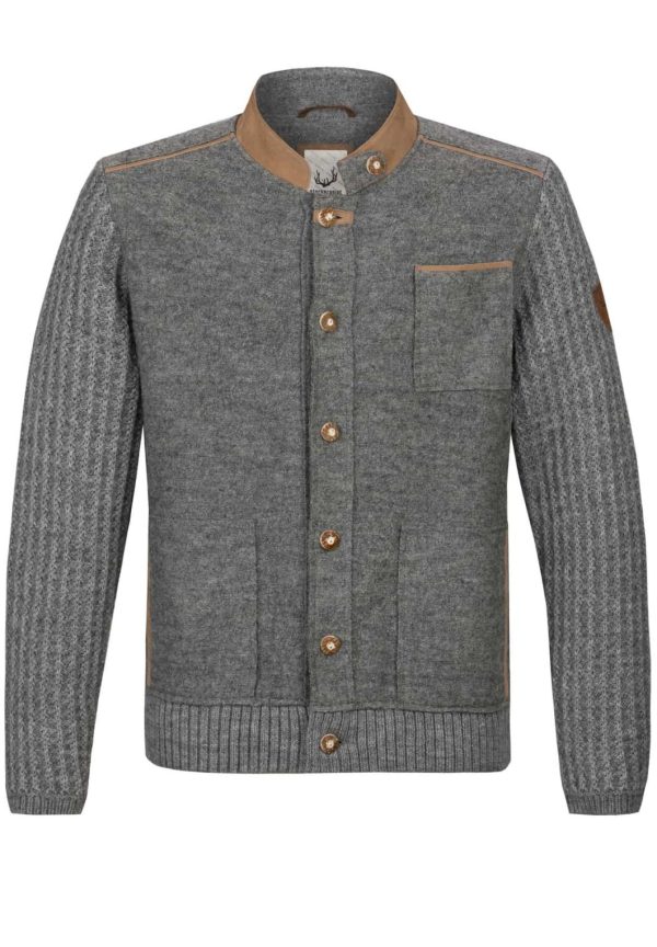 Herrenjacke Savino von Stockerpoint Classics in grau. Mit edlem Materialmix präsentiert sich diese trachtige Stehkragenjacke und imponiert neben der markanten Optik auch mit trachtigen Details. Der raffinierte Kragen mit geknöpfter Lasche ist aus Leder gearbeitet. Der gestrickte Ärmel unterstreicht den sportiven Flair. Das exklusive Logo prägt das markentypische Aussehen.