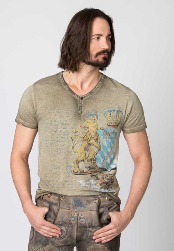T-Shirt Bene von Mountain Rocker in sand. Das im „Comfort-Fit“ geschnittene Trachtenshirt aus der „True Bavaria Kollektion“ in hochwertiger Baumwoll-Qualität überzeugt durch den angesagten Bayernwappen Print und dem Schriftzug Bayern. Für die coole Optik sorgt die trendige „Used washed Optik“ und setzt das stylische Designmotiv perfekt in Szene. Der V-Ausschnitt mit Knopfleiste ist mit passend abgestimmten Knöpfen verziert und sorgt zusätzlich für den einzigartigen Look. Das Shirt lässt sich lässig zu Lederhose und zur Jeans tragen und ist ein unverzichtbares Statement für coole Typen.