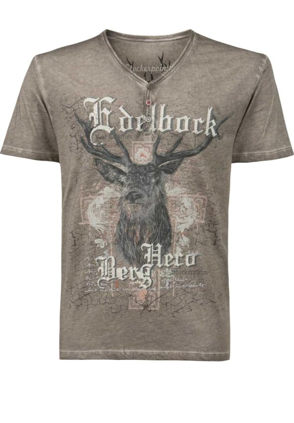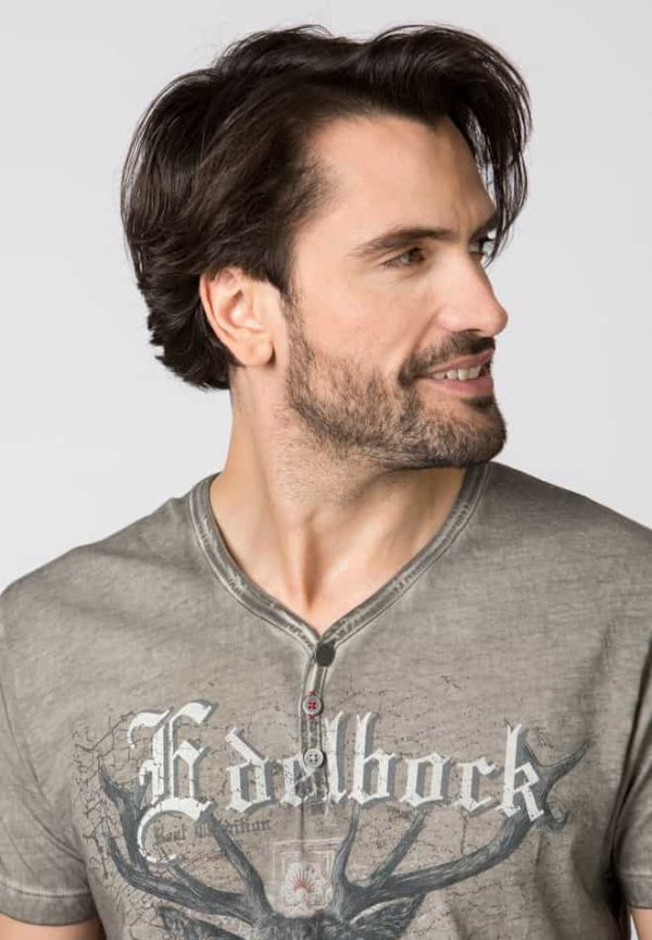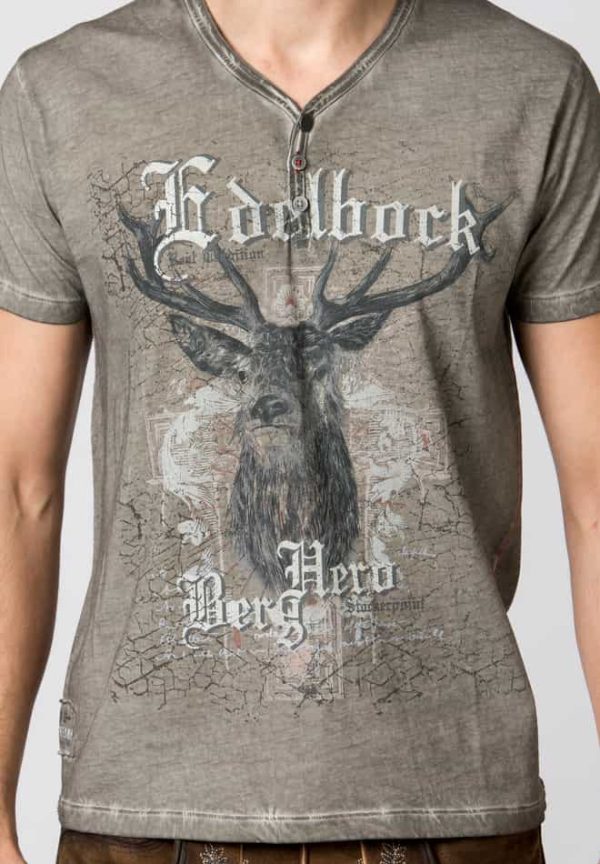 T-Shirt Berghero von Mountain Rocker. Das im „Comfort-Fit“ geschnittene Trachtenshirt aus der „Wiesn RiderKollektion“ in hochwertiger Baumwoll-Qualität überzeugt durch den angesagten Print mit dem Schriftzug „Edelbock“. Für die coole Optik sorgt die trendige „Used washed Optik“ und setzt das stylische Designmotiv perfekt in Szene. Der V-Ausschnitt mit Knopfleiste ist mit passend abgestimmten Knöpfen verziert und sorgt zusätzlich für den einzigartigen Look. Das Shirt lässt sich lässig zu Lederhose und zur Jeans tragen und ist ein unverzichtbares Statement für coole Typen.