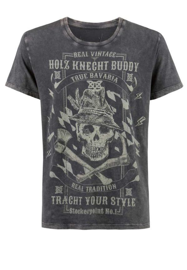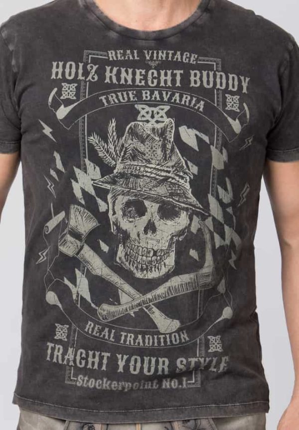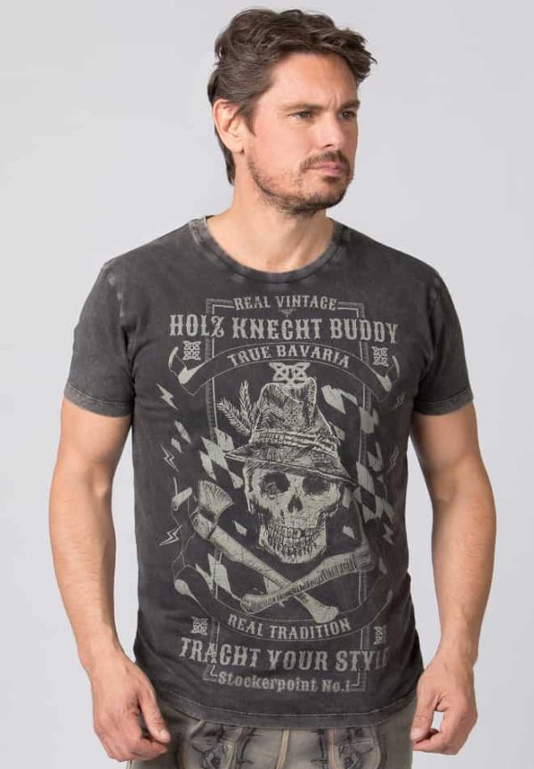 T-Shirt Buddy von Mountain Rocker in Anthrazit. Das im „Comfort-Fit“ geschnittene Trachtenshirt in hochwertiger Baumwoll-Qualität überzeugt durch den angesagten Print mit dem Schriftzug „Holz Knecht Buddy“. Für die coole Optik sorgt die trendige „Used washed Optik“ und setzt das stylische Designmotiv perfekt in Szene. Der aufwändig verarbeitete Rundhals-Ausschnitt sorgt zusätzlich für den einzigartigen Look. Das Shirt lässt sich lässig zu Lederhose und zur Jeans tragen und ist ein unverzichtbares Statement für coole Typen.
