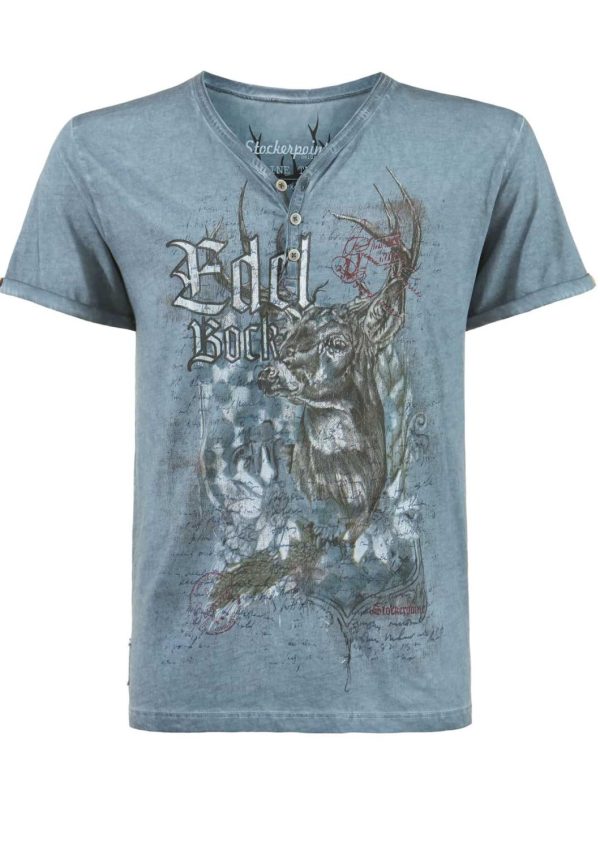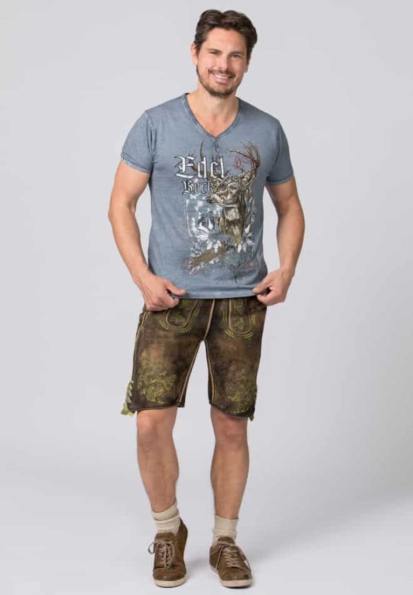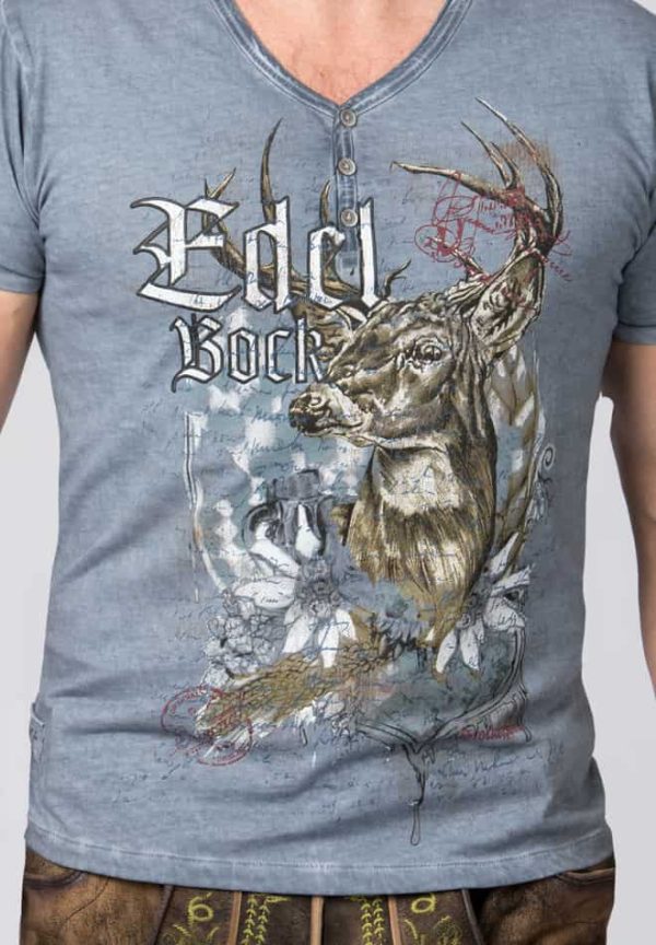 T-Shirt Edelbock von Mountain Rocker. Das im „Comfort-Fit“ geschnittene Trachtenshirt aus der „Wiesn Rider Kollektion“ in hochwertiger Baumwoll-Qualität überzeugt durch den angesagten Print mit dem Schriftzug „Edelbock“. Für die coole Optik sorgt die trendige „Used washed Optik“ und setzt das stylische Designmotiv perfekt in Szene. Der V-Ausschnitt mit Knopfleiste ist mit passend abgestimmten Knöpfen verziert und sorgt zusätzlich für den einzigartigen Look. Das Shirt lässt sich lässig zu Lederhose und zur Jeans tragen und ist ein unverzichtbares Statement für coole Typen.