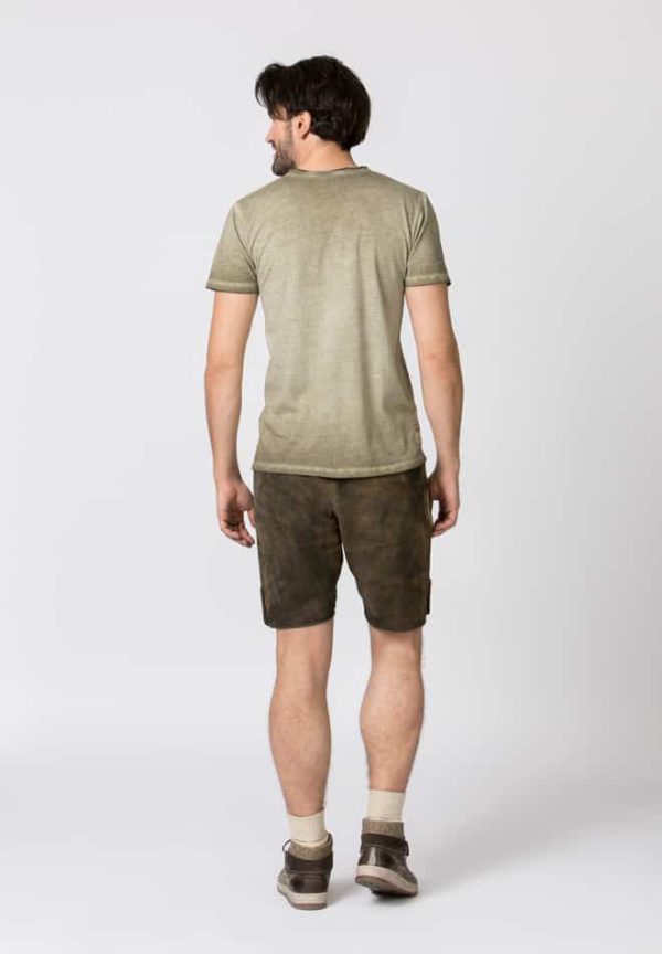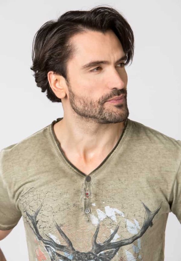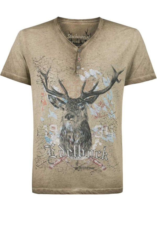 T-Shirt Günther von Mountain Rocker in sand. Das im „Comfort-Fit“ geschnittene Trachtenshirt aus der „Wiesn Rider“ Kollektion“ in hochwertiger Baumwoll-Qualität überzeugt durch den angesagten Print mit dem Schriftzug „Edelbock“. Für die coole Optik sorgt die trendige „Used washed Optik“ und setzt das stylische Designmotiv perfekt in Szene. Der V-Ausschnitt mit Knopfleiste ist mit passend abgestimmten Knöpfen verziert und sorgt zusätzlich für den einzigartigen Look. Das Shirt lässt sich lässig zu Lederhose und zur Jeans tragen und ist ein unverzichtbares Statement für coole Typen.