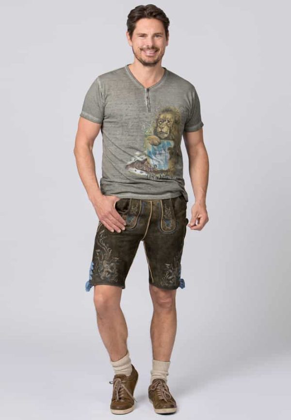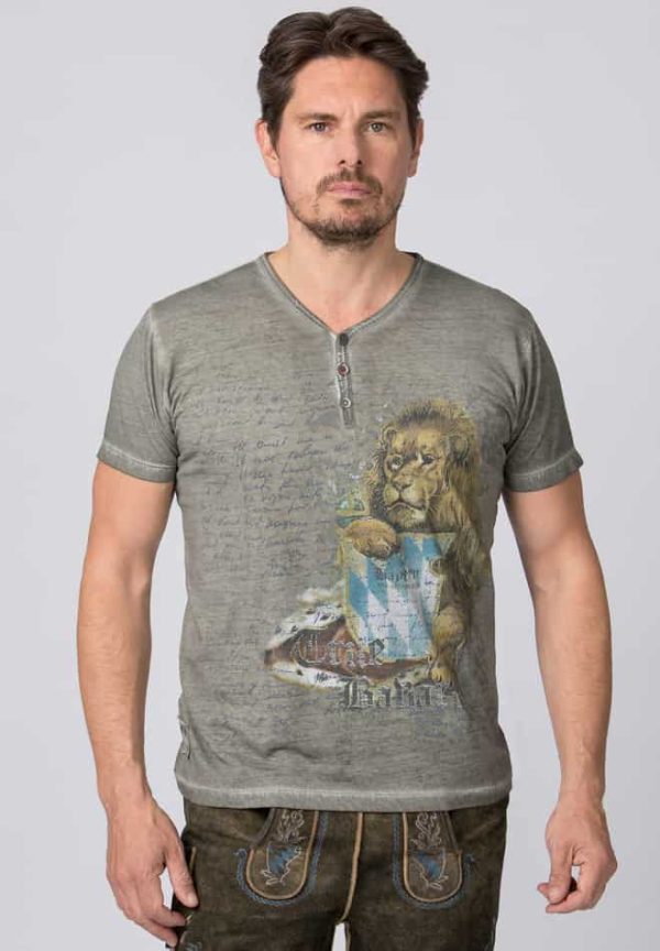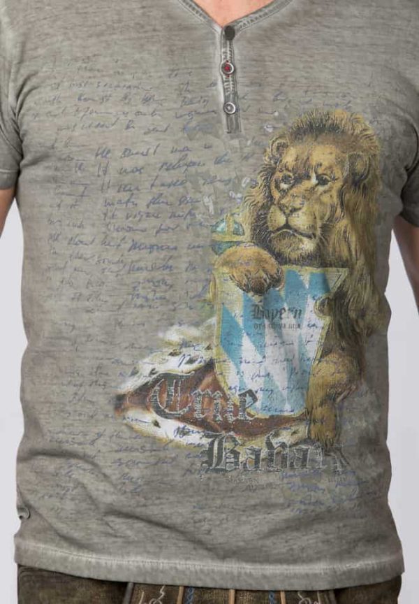 T-Shirt True Bavaria von Mountain Rocker in stein. Das im „Comfort-Fit“ geschnittene Trachtenshirt aus der „True Bavaria Kollektion“ in hochwertiger Baumwoll-Qualität überzeugt durch den angesagten Bayernwappen Print und dem Schriftzug Bayern. Für die coole Optik sorgt die trendige „Used washed Optik“ und setzt das stylische Designmotiv perfekt in Szene. Der V-Ausschnitt mit Knopfleiste ist mit passend abgestimmten Knöpfen verziert und sorgt zusätzlich für den einzigartigen Look. Das Shirt lässt sich lässig zu Lederhose und zur Jeans tragen und ist ein unverzichtbares Statement für coole Typen|