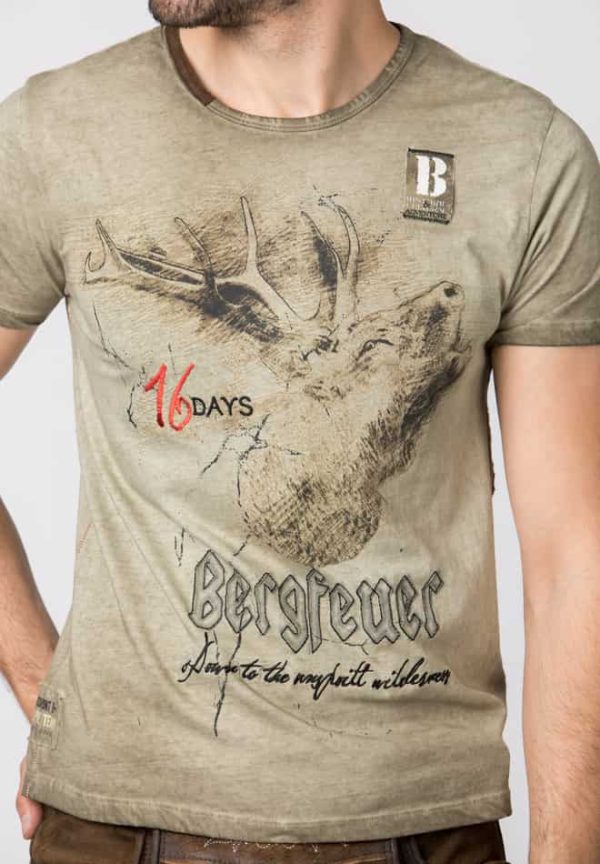 Mountain Rocker Herren T-Shirt Urschrei. Das Trachtenshirt aus hochwertiger Baumwoll-Qualität aus der Mountain Rocker Kollektion überzeugt durch traditionelle Details. Stylische Patches, Stickereien und der einzigartige „Hirsch-Print“ setzen das Modell gekonnt in Szene. Für die coole Optik sorgt die trendige „Oil-Washed Optik“. Der mit Lederimitat besetzte Rundhals Ausschnitt sorgt zusätzlich für den unverwechselbaren, trachtigen Look. Der ideale Begleiter für coole Typen.