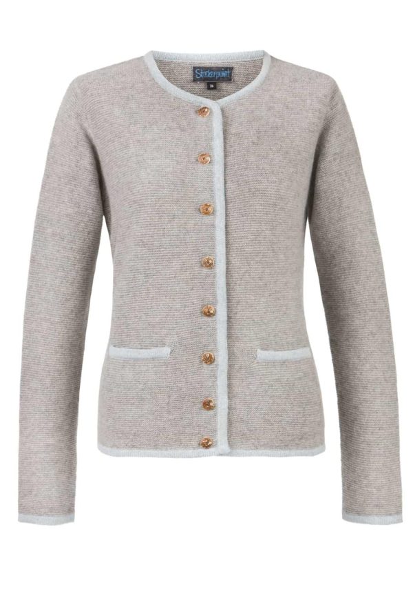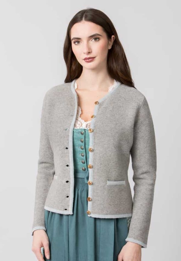 Trachten Strickjacke Caro von Heimatgwand. Die Jacke bekommt durch die kuschlige, melierte Wollmischung den charakteristischen Trachtenlook. Die traditionelle „Links-Links“ Strickoptik, die farblich abgesetzten Kanten und Eingriffstaschen runden das klassische Modell gekonnt ab. Die hochwertigen Hirschhornknöpfe sind liebevoll mit einem Straßstein verziert und Sorgen für den trachtigen Look. Die gerade geschnittene Trachtenjacke sorgt für eine legere Passform und einen bequemen Tragekomfort. Ein Lieblingsmodell für viele Gelegenheiten.