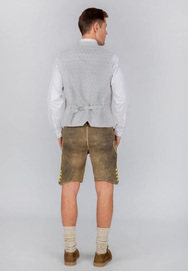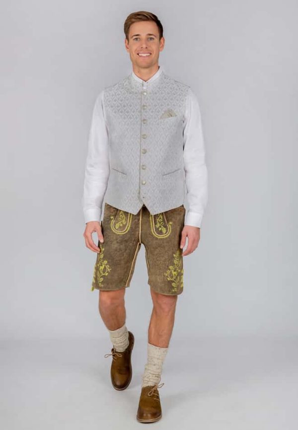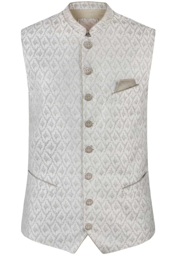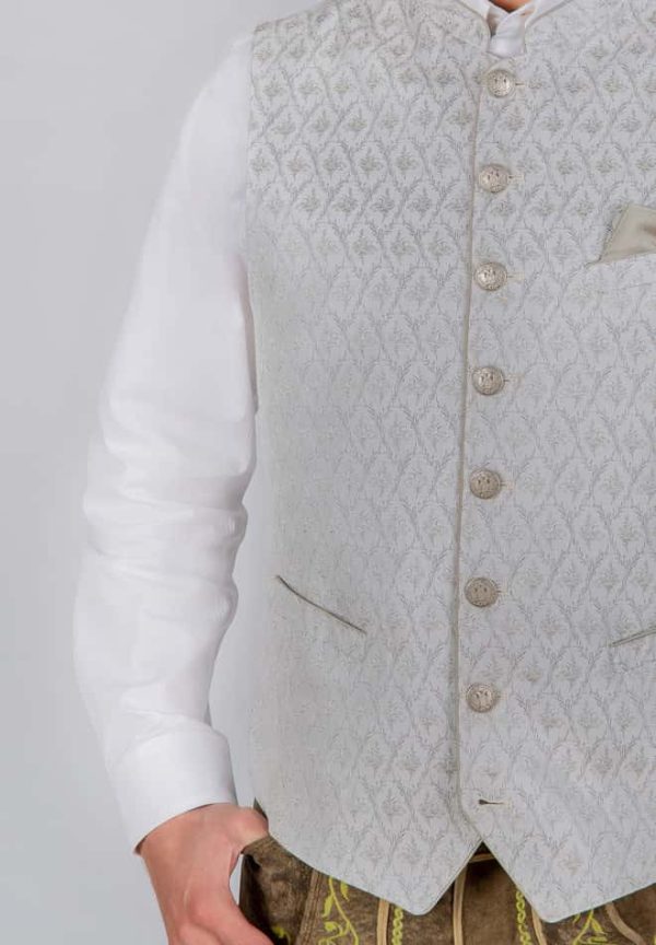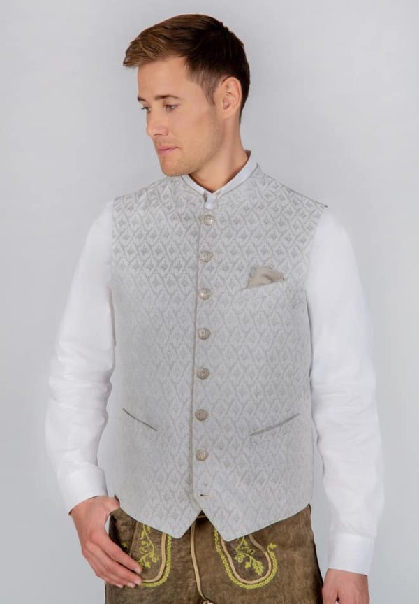 Trachtenweste Armando von Bergfeuer in taupe. Die hochwertige Weste ist aus einem hochwertigen Jacquard Stoff in Seidenoptik gefertigt. Die gerade Schnittführung garantiert eine sehr gute Passform und einen angenehmen Tragekomfort. Der klassische Stehkragen, die Taschen und die Knopfleiste sind mit einem farblich abgestimmten Paspel gefertigt und unterstreichen das exklusive Design. Trachtige Knöpfe in altsilber setzen sich gekonnt in Szene. Die Weste ist der ideale Kombipartner zu unseren Trachtensakkos und runden den Trachtenlook perfekt ab.|