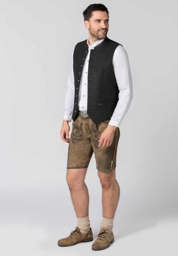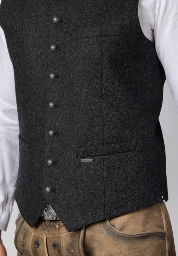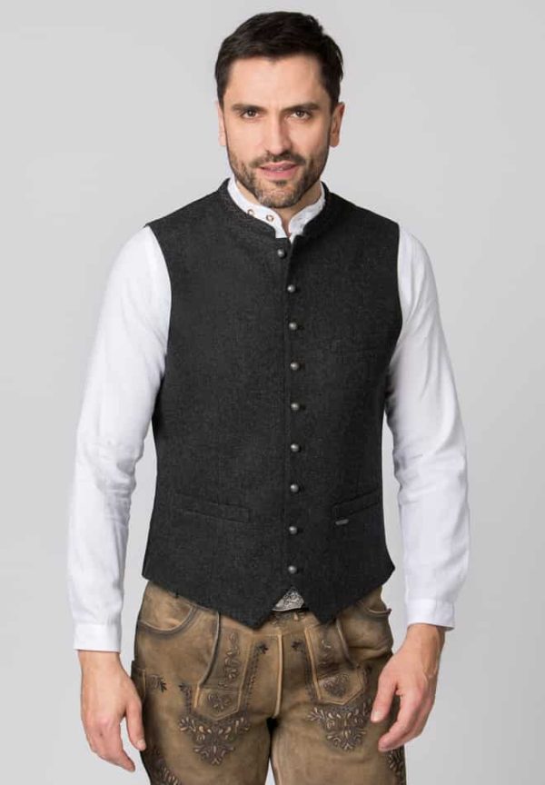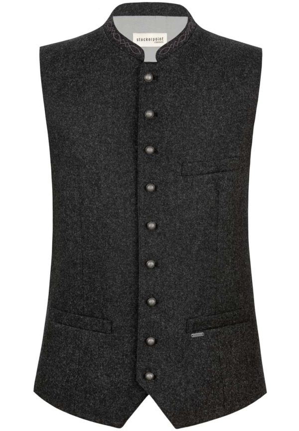 Trachtenweste Devito von Stockerpoint Classics. Die traditionelle Weste ist aus einer hochwertigen melierten Lodenqualität gefertigt. Die klassische, gerade Schnittführung garantiert eine sehr gute Passform und einen angenehmen Tragekomfort. Harmonisch abgestimmter, bestickter Stehkragen und Paspel unterstreichen das besondere Design. Der Rücken ist aus einem exklusiven, schwarzen Baumwollstoff gefertigt und lässt sich mit einem Riegel verstellen. Kugelknöpfe in altsilber runden das edle Erscheinungsbild gekonnt ab. Die Trachtenweste ist der ideale Kombipartner zu unseren Lederhosen und Trachtenwesten und prägen den klassischen Trachtenlook.