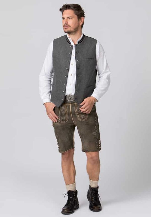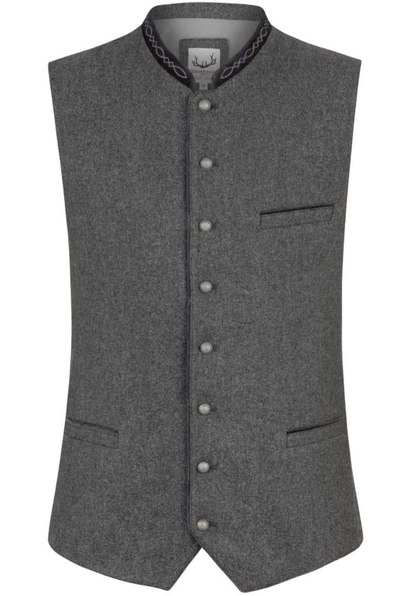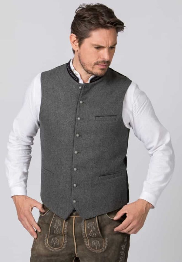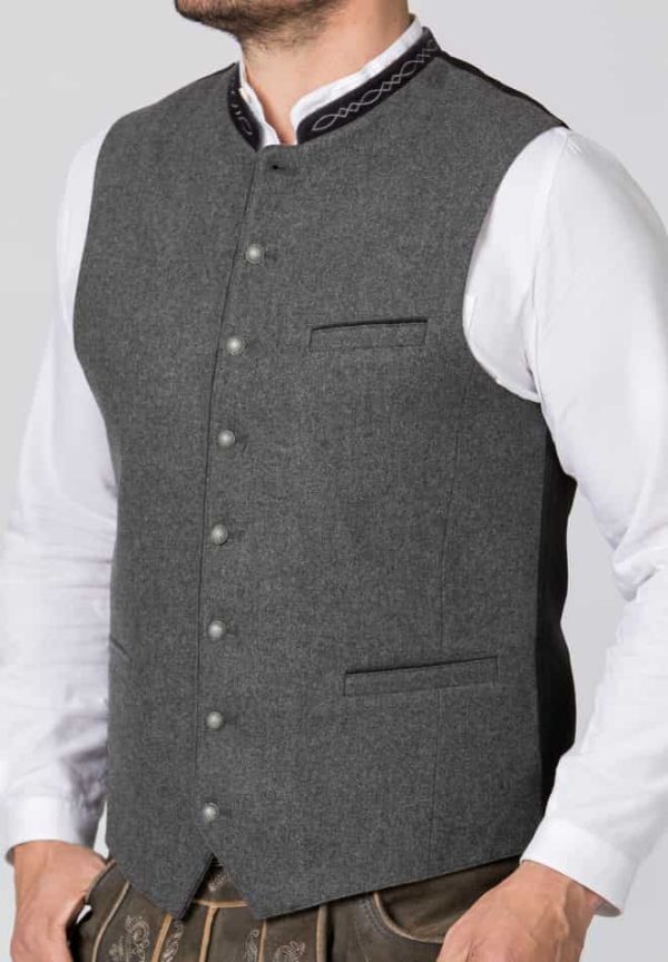 Trachtenweste Fabricio von Stockerpoint Classics. Die klassische Weste aus hochwertigem, melierten Lodenstoff ist der Klassiker unter den Trachtenwesten. Der Stehkragen ist aus feinem Baumwollsamt mit einer traditionellen Stickerei dezent bestickt und prägt den unverwechselbaren Stil. Farblich abgestimmte Paspel unterstreichen das traditionelle Design. Die klassische, gerade Schnittführung garantiert eine sehr gute Passform und einen angenehmen Tragekomfort. Der Rücken ist aus einem exklusiven, schwarz gestreiften Satinstoff gefertigt und lässt sich mit einem Riegel verstellen. Geprägte Kugelknöpfe aus altsilber runden das edle Erscheinungsbild gekonnt ab. Die Trachtenweste ist der ideale Kombipartner zu unseren traditionellen Trachtenhemden und Lederhosen.