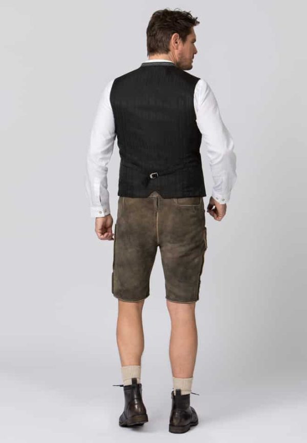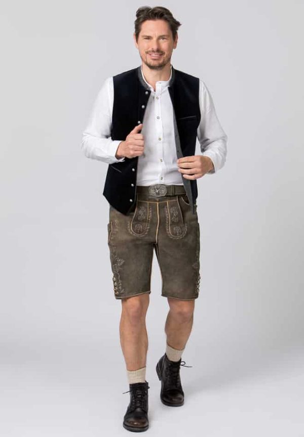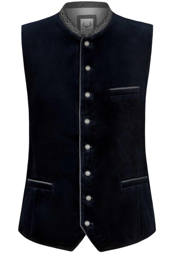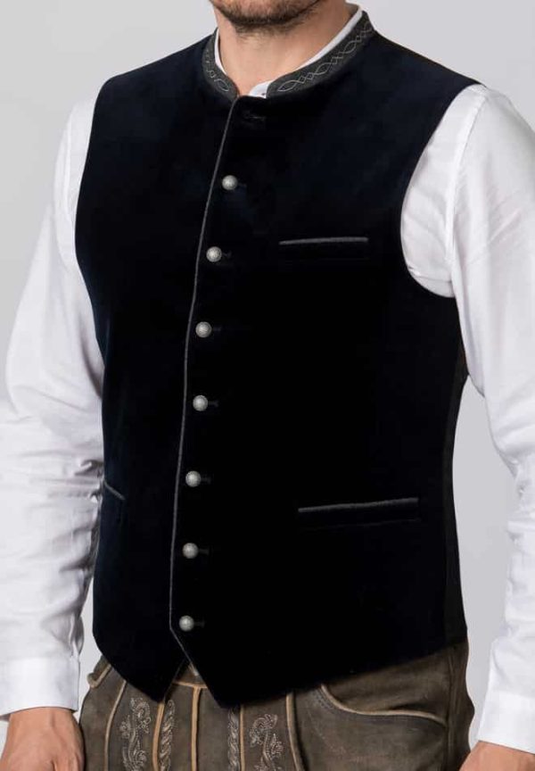 Trachtenweste Lorenzo von Stockerpoint Classics. Die klassische Weste aus hochwertigem Baumwollsamt ist der Klassiker unter den Trachtenwesten. Der Stehkragen ist aus hochwertigem, dezent bestickten Lodenstoff gearbeitet und prägt den unverwechselbaren Stil. Farblich abgestimmte Paspel unterstreichen das traditionelle Design. Die klassische, gerade Schnittführung garantiert eine sehr gute Passform und einen angenehmen Tragekomfort. Der Rücken ist aus einem exklusiven, schwarz gestreiften Jacquardstoff gefertigt und lässt sich mit einem Riegel verstellen. Geprägte Kugelknöpfe aus altsilber runden das edle Erscheinungsbild gekonnt ab. Die Trachtenweste ist der ideale Kombipartner zu unseren traditionellen Trachtenhemden und Lederhosen. Alles neu und doch ein Stück Heimat.