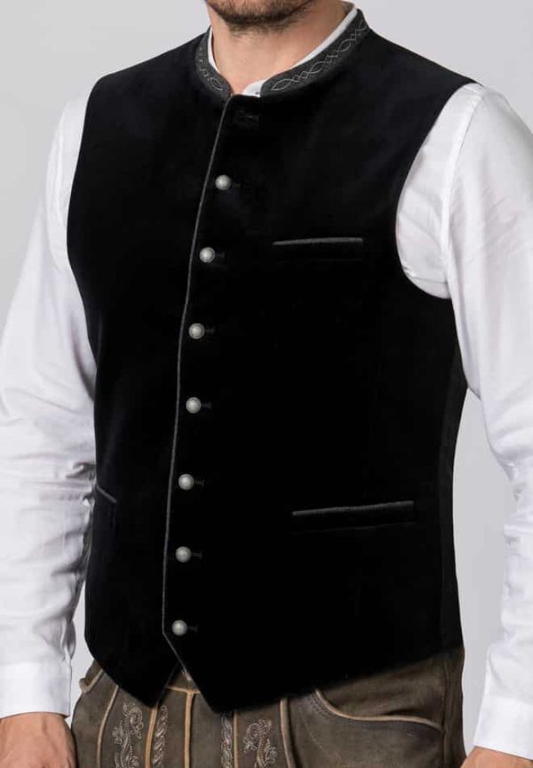 Trachtenweste Lorenzo von Stockerpoint Classics. Die klassische Weste aus hochwertigem Baumwollsamt ist der Klassiker unter den Trachtenwesten. Der Stehkragen ist aus hochwertigem, dezent bestickten Lodenstoff gearbeitet und prägt den unverwechselbaren Stil. Farblich abgestimmte Paspel unterstreichen das traditionelle Design. Die klassische, gerade Schnittführung garantiert eine sehr gute Passform und einen angenehmen Tragekomfort. Der Rücken ist aus einem exklusiven, schwarz gestreiften Jacquardstoff gefertigt und lässt sich mit einem Riegel verstellen. Geprägte Kugelknöpfe aus altsilber runden das edle Erscheinungsbild gekonnt ab. Die Trachtenweste ist der ideale Kombipartner zu unseren traditionellen Trachtenhemden und Lederhosen. Alles neu und doch ein Stück Heimat.