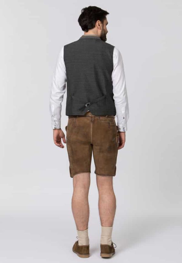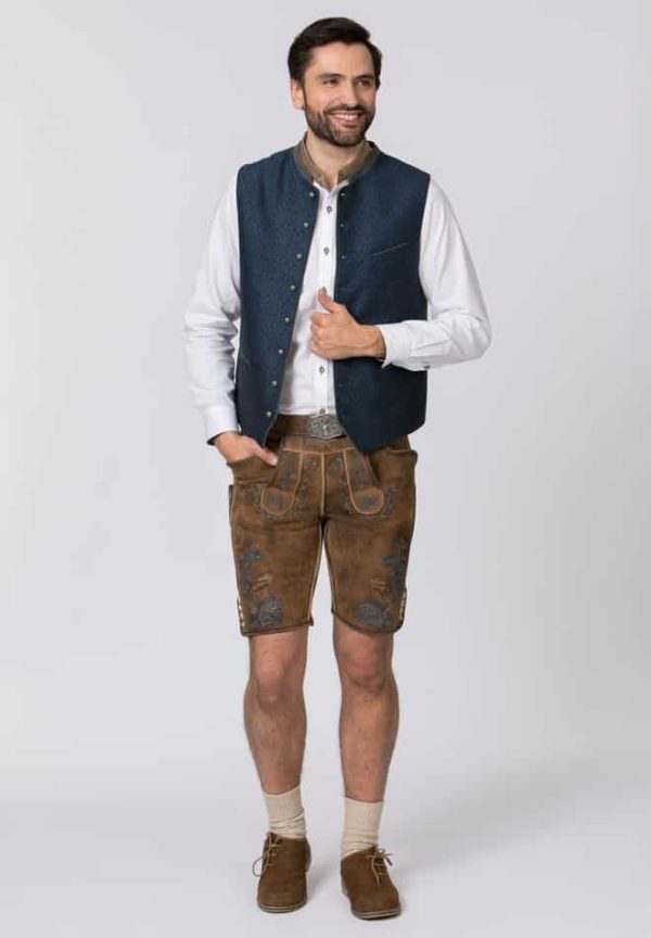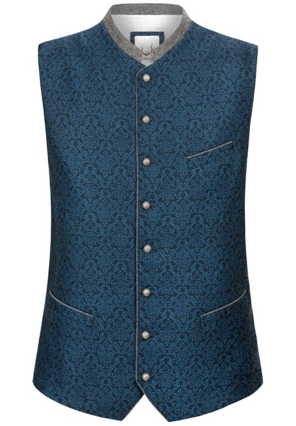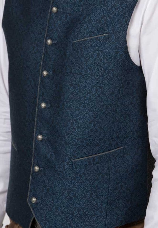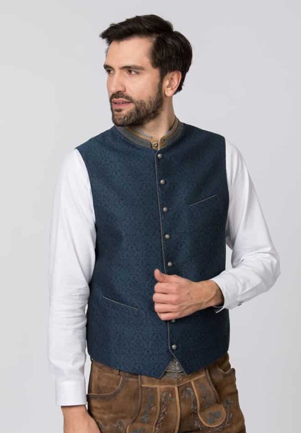 Trachtenweste Marino von Stockerpoint Classics. Die traditionelle Weste aus hochwertig gewebten Strukturstoff ist der Klassiker unter den Trachtenwesten. Der Stehkragen und die farblich abgestimmten Paspel sind aus meliertem Lodenstoff und prägen den unverwechselbaren Stil. Die klassische, gerade Schnittführung garantiert eine sehr gute Passform und einen angenehmen Tragekomfort. Der Rücken ist aus einem exklusiven, schwarzen Baumwollstoff gefertigt und lässt sich mit einem Riegel verstellen. Geprägte Kugelknöpfe in altsilber runden das edle Erscheinungsbild gekonnt ab. Die Trachtenweste ist der ideale Kombipartner zu unseren Lederhosen und Trachtensakkos und prägen den klassischen Trachtenlook.