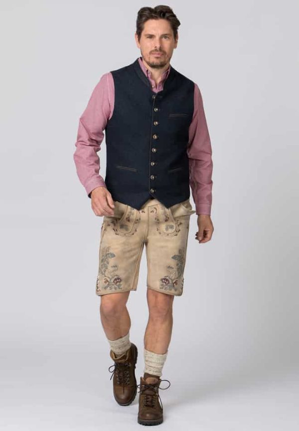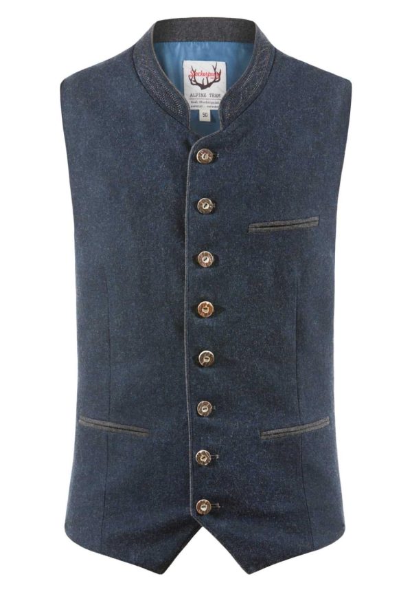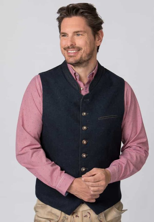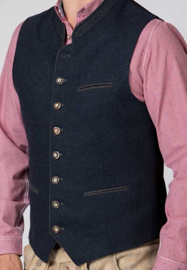 Trachtenweste Sirius von Stockerpoint Classics. Die traditionelle Weste ist aus einer hochwertigen melierten Lodenqualität gefertigt. Die klassische, gerade Schnittführung garantiert eine sehr gute Passform und einen angenehmen Tragekomfort. Harmonisch abgestimmter, bestickter Stehkragen und Paspel unterstreichen das besondere Design. Der Rücken ist aus einem exklusiven, schwarzen Baumwollstoff gefertigt und lässt sich mit einem Riegel verstellen. Rustikale Hornknöpfe runden das edle Erscheinungsbild gekonnt ab. Die Trachtenweste ist der ideale Kombipartner zu unseren Lederhosen und Trachtenwesten und prägen den klassischen Trachtenlook.