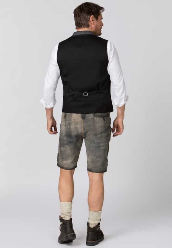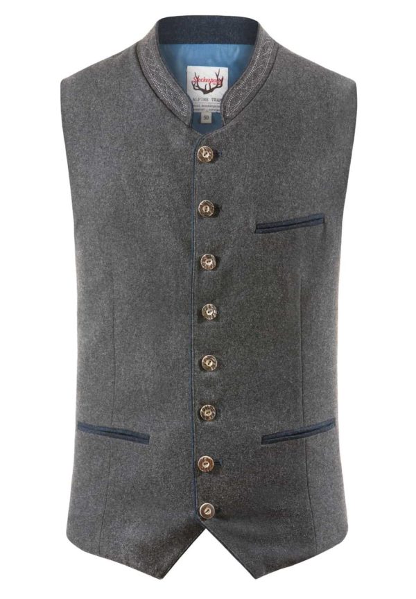 Trachtenweste Sirius von Stockerpoint Classics. Die traditionelle Weste ist aus einer hochwertigen melierten Lodenqualität gefertigt. Die klassische, gerade Schnittführung garantiert eine sehr gute Passform und einen angenehmen Tragekomfort. Harmonisch abgestimmter, bestickter Stehkragen und Paspel unterstreichen das besondere Design. Der Rücken ist aus einem exklusiven, schwarzen Baumwollstoff gefertigt und lässt sich mit einem Riegel verstellen. Rustikale Hornknöpfe runden das edle Erscheinungsbild gekonnt ab. Die Trachtenweste ist der ideale Kombipartner zu unseren Lederhosen und Trachtenwesten und prägen den klassischen Trachtenlook.